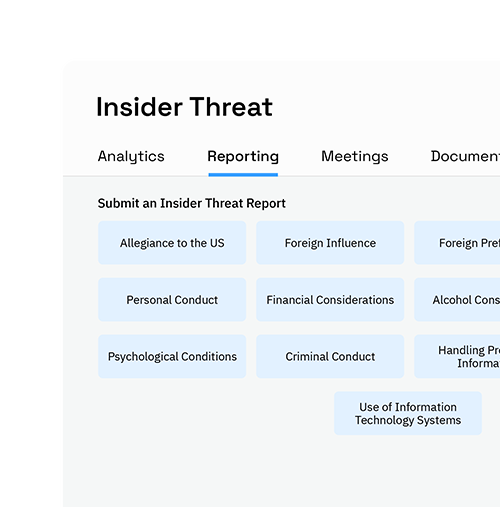 Our Insider Threat Module allows you to easily capture and track relevant insider threat data. Easily view and report data that has been collected.